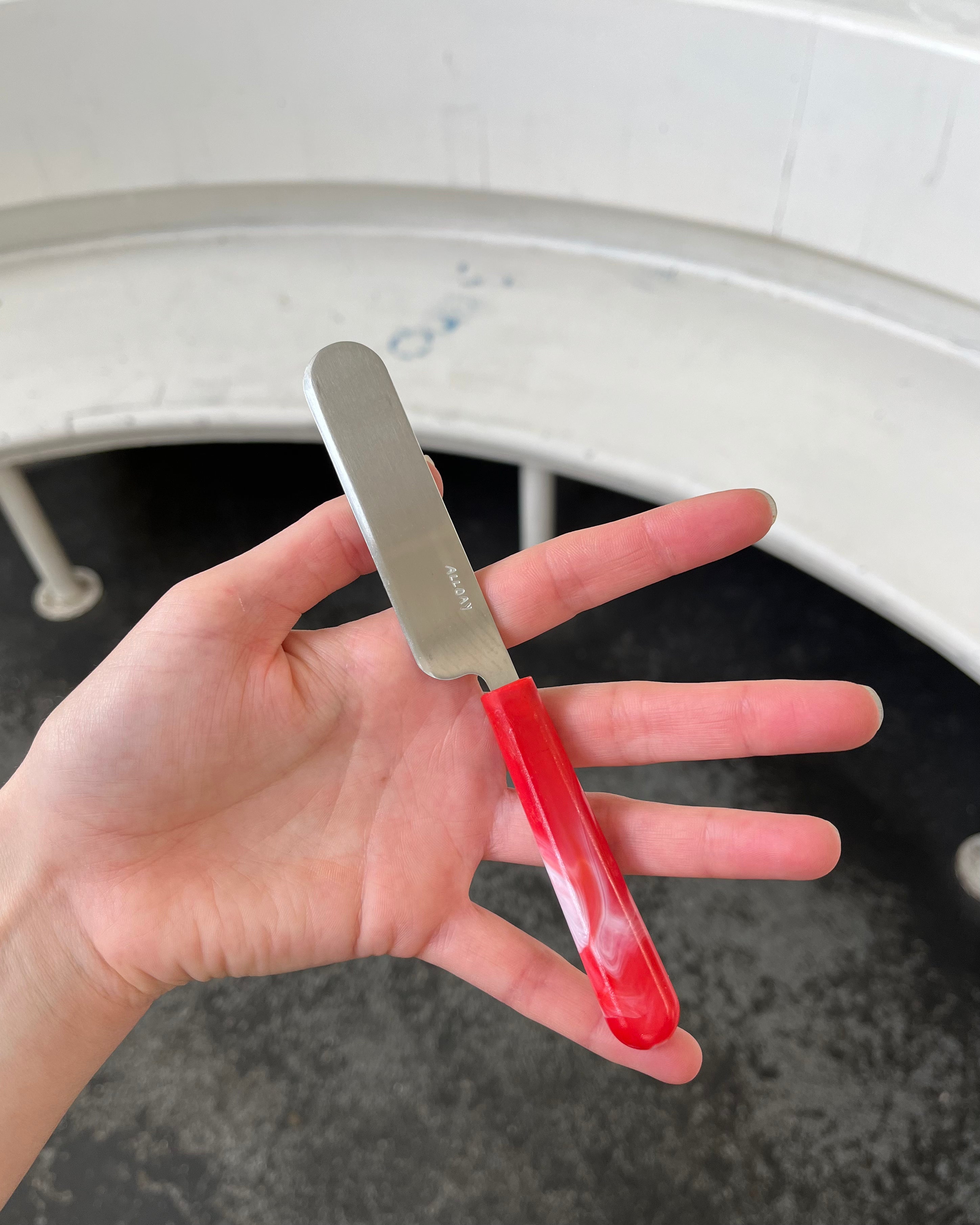 This is our Stainless Butter knife. It is in perfect working order, the colour of the handle is just slightly more red than usual.