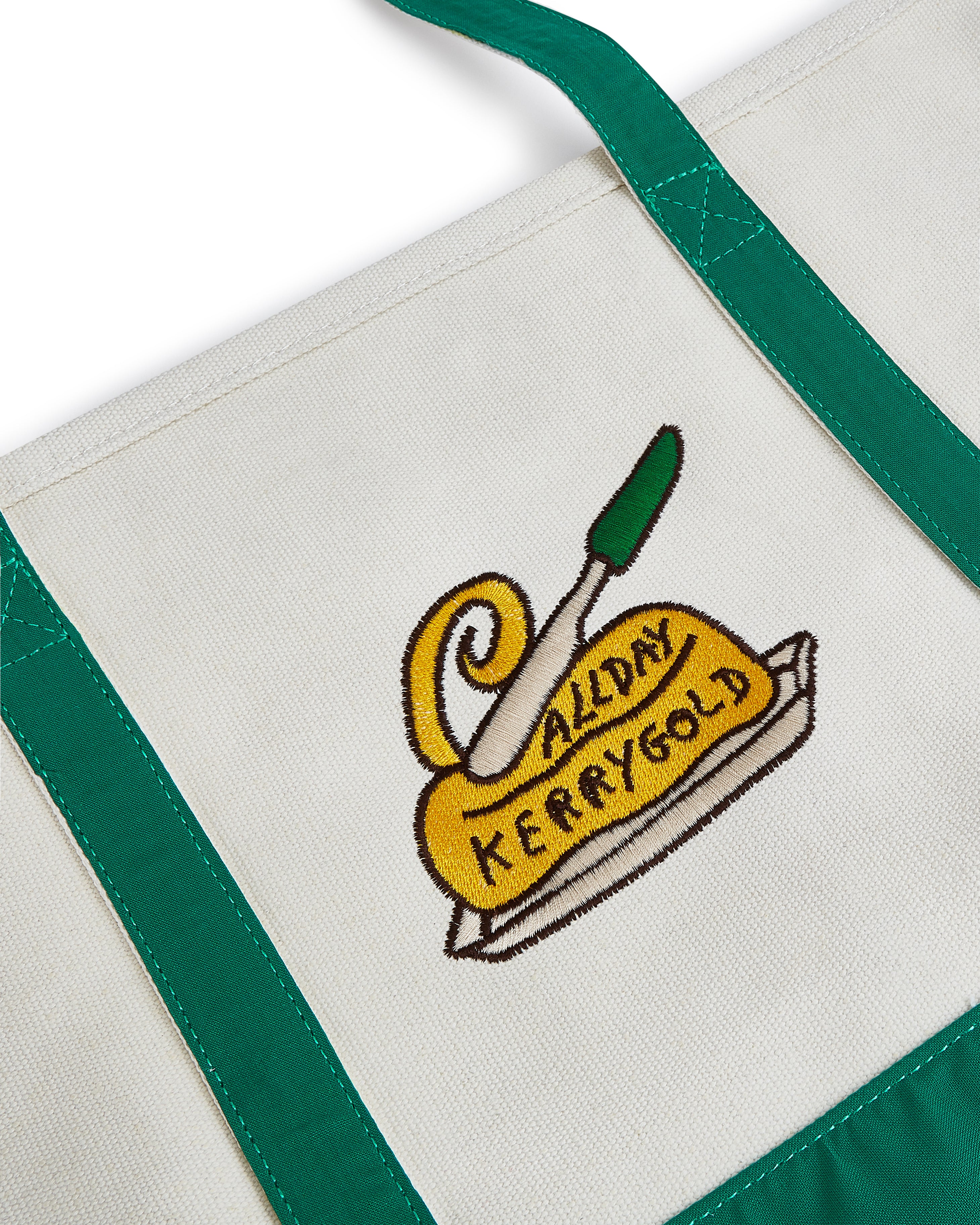 Our Kerrygold x Allday bag with a green trim, embroidered in Deptford, London.