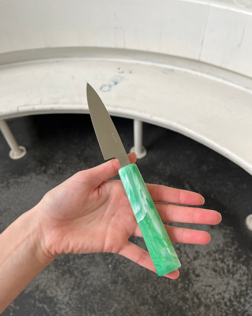 This is our Everyday Petty knife. It is in perfect working order, there are just small cosmetic imperfections to the blade or the handle.